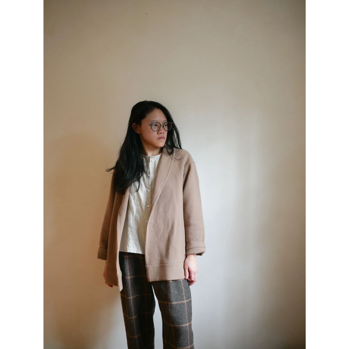 The Daphne Jacket pattern is designed for woven fabrics. It works best for heavyweight fabrics that are finished on both sides. Examples are wool coating, boiled wool, tweed, flannel, double-faced fabrics, and quilted fabrics. Keep in mind that the jacket is unlined, so the “wrong” side of the fabric becomes the “right” side of the collar lapel.