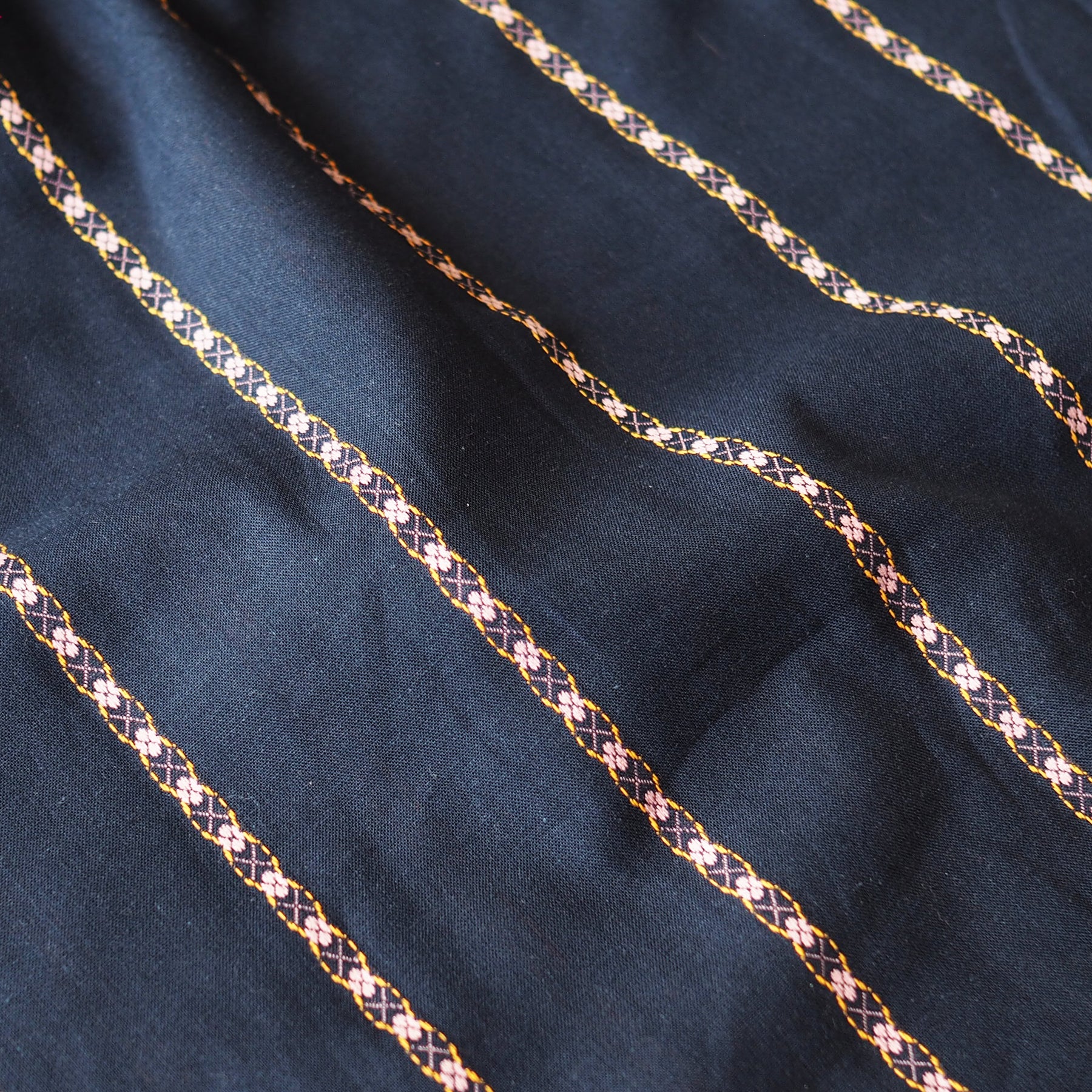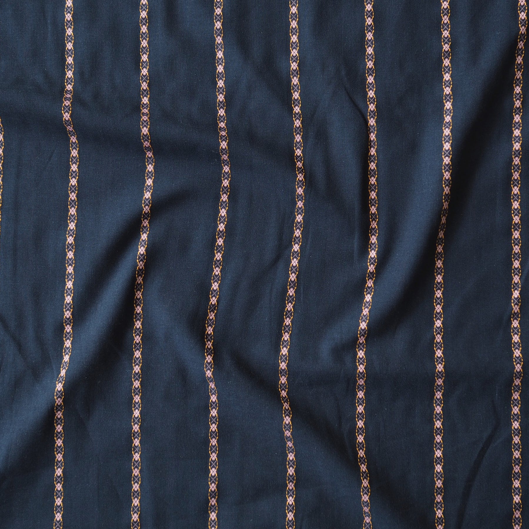 This Navy Floral Chain Stripe Cotton Jacquard is a lightweight textured fabric, ideal for sewing blouses and shirts.
