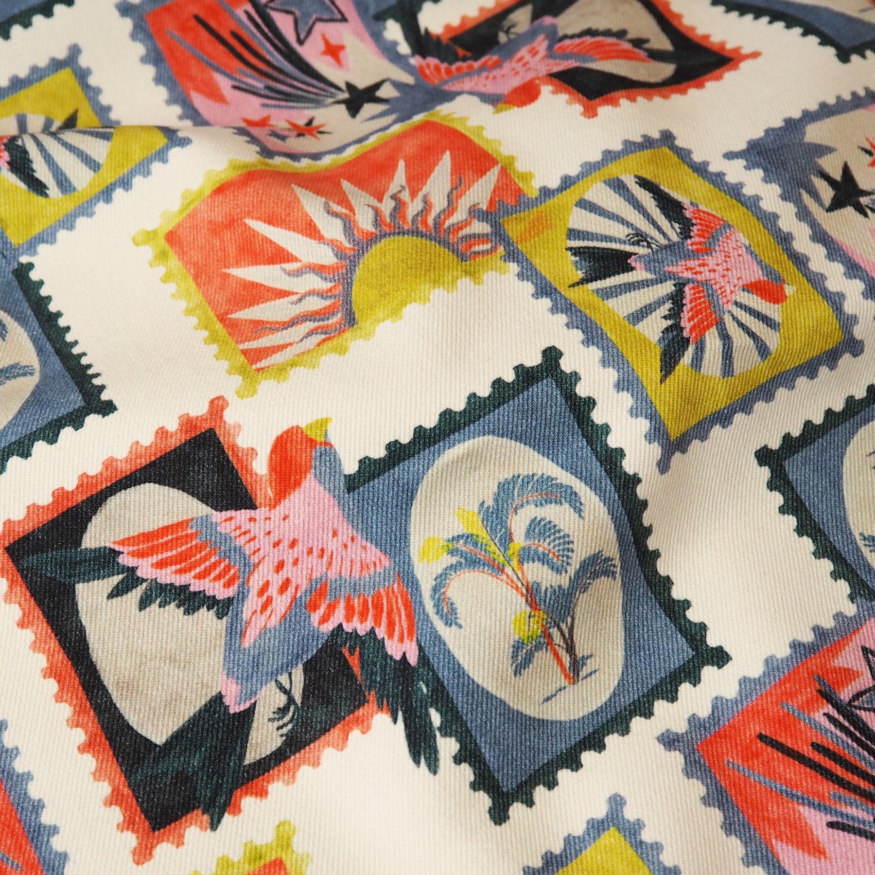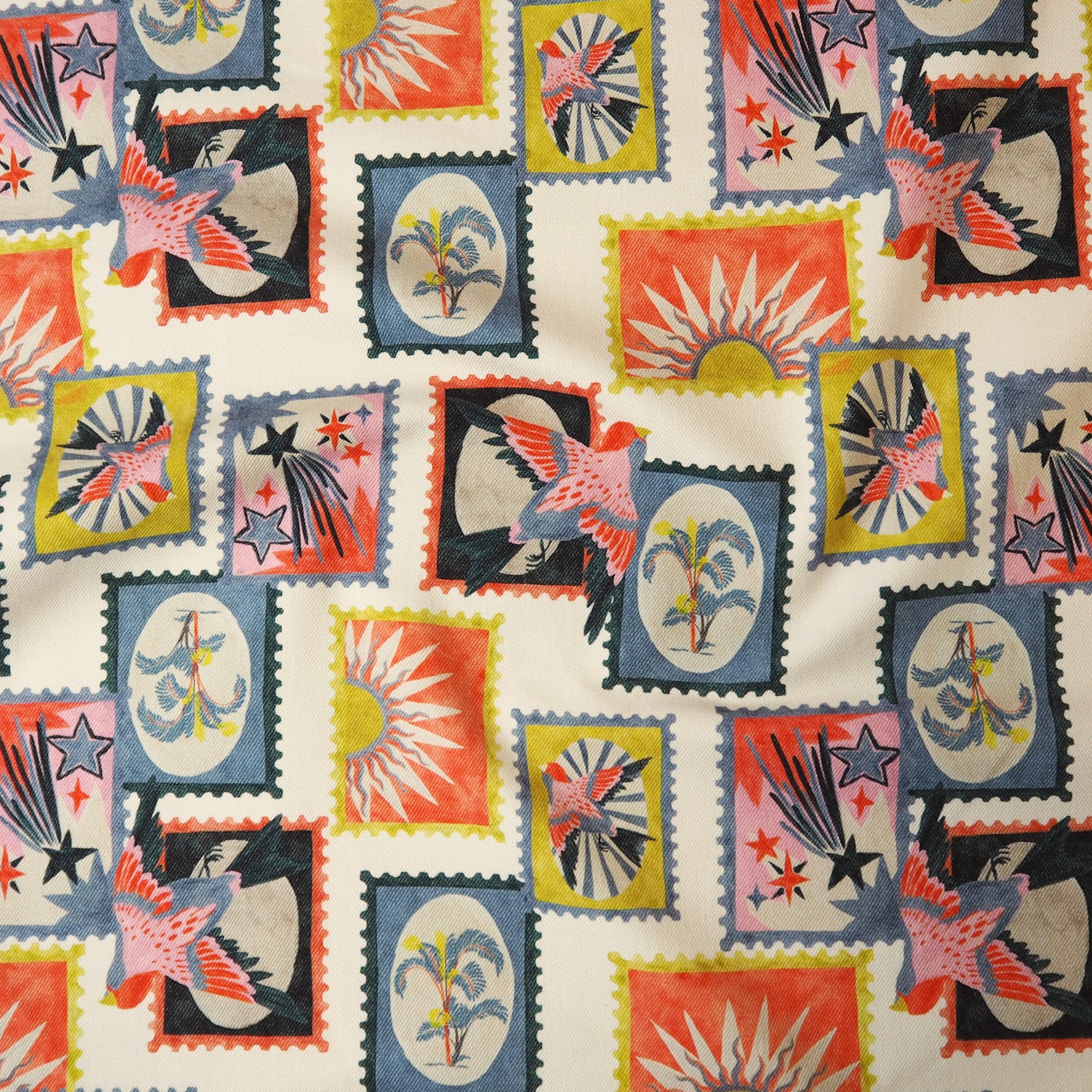 Yoko features a retro inspired postcard print, featuring tropical birds, trees, stars and suns.