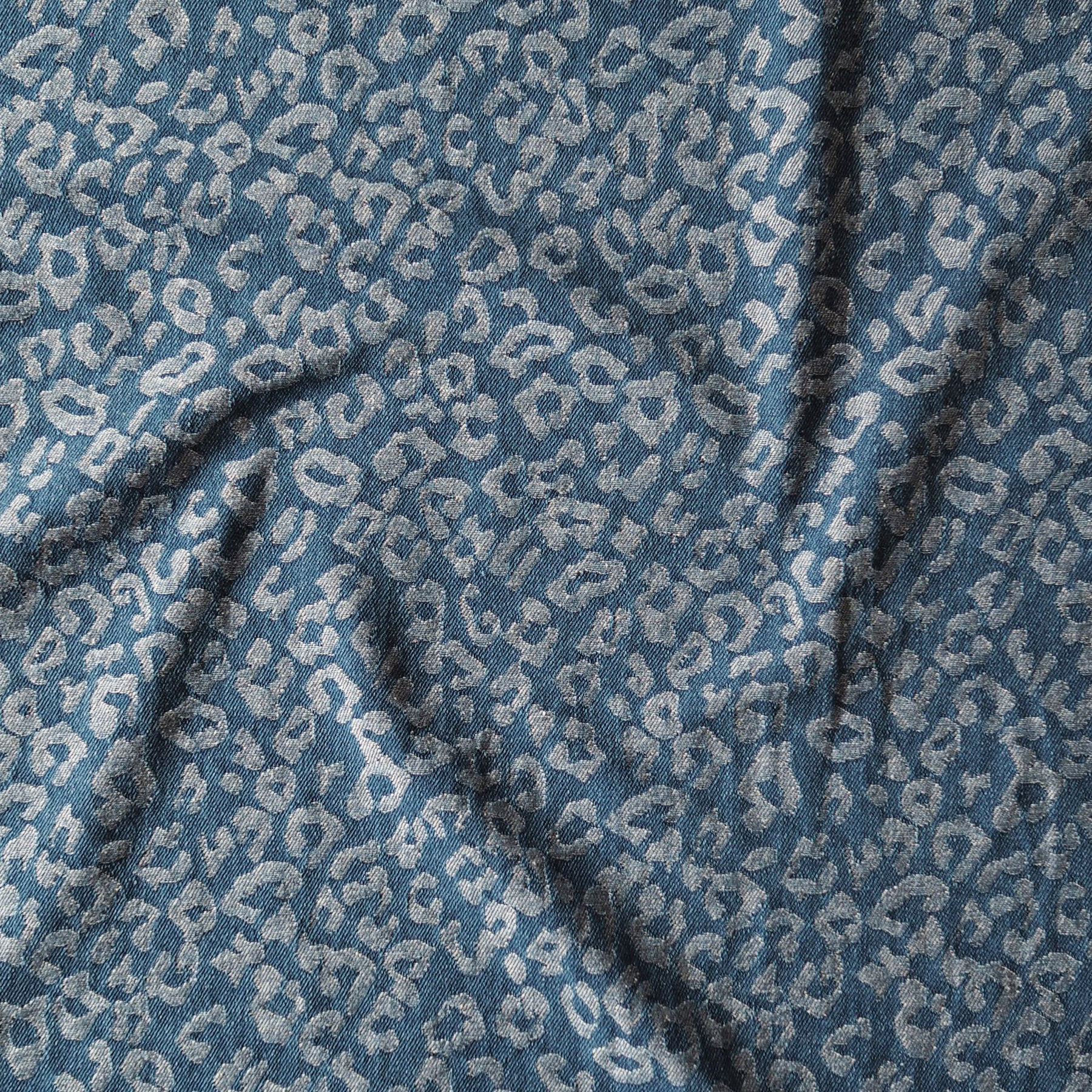 This denim features a woven leopard pattern created through a jacquard weave rather than a printed design. The subtle texture of the pattern gives the fabric depth and visual interest. The soft blue base makes it feel modern and slightly playful while still remaining versatile for everyday garments.
