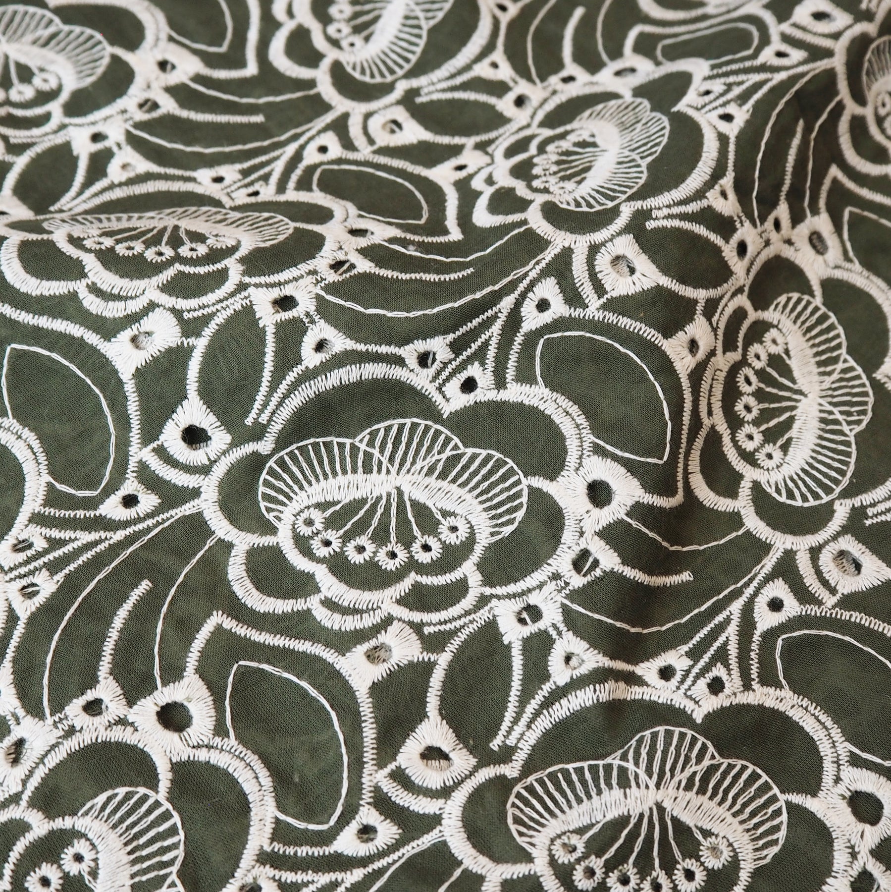 The playful cream embroidered floral motifs arranged in a puzzle-like layout across the khaki green base give this fabric a modern, creative edge.