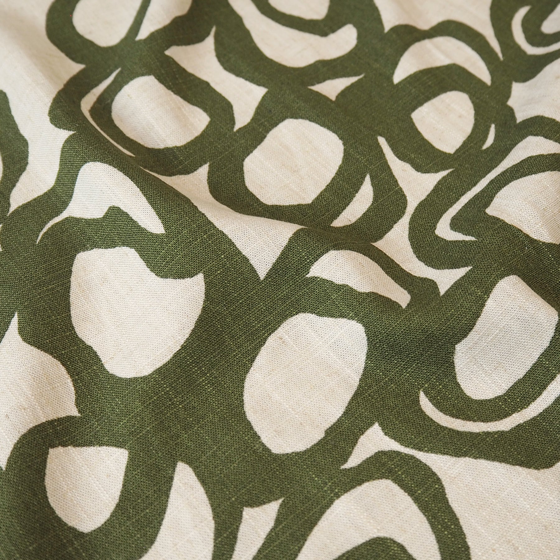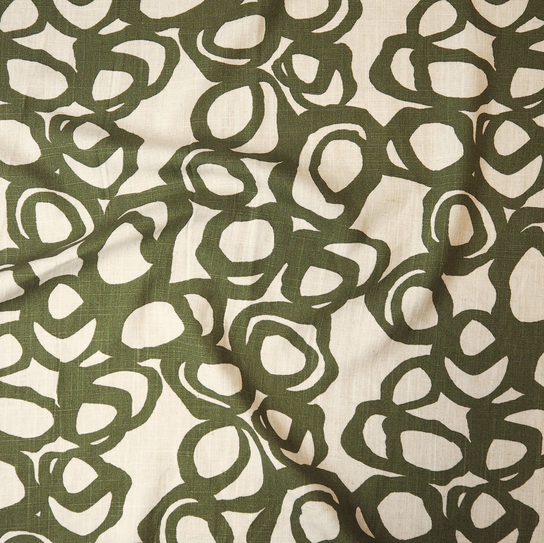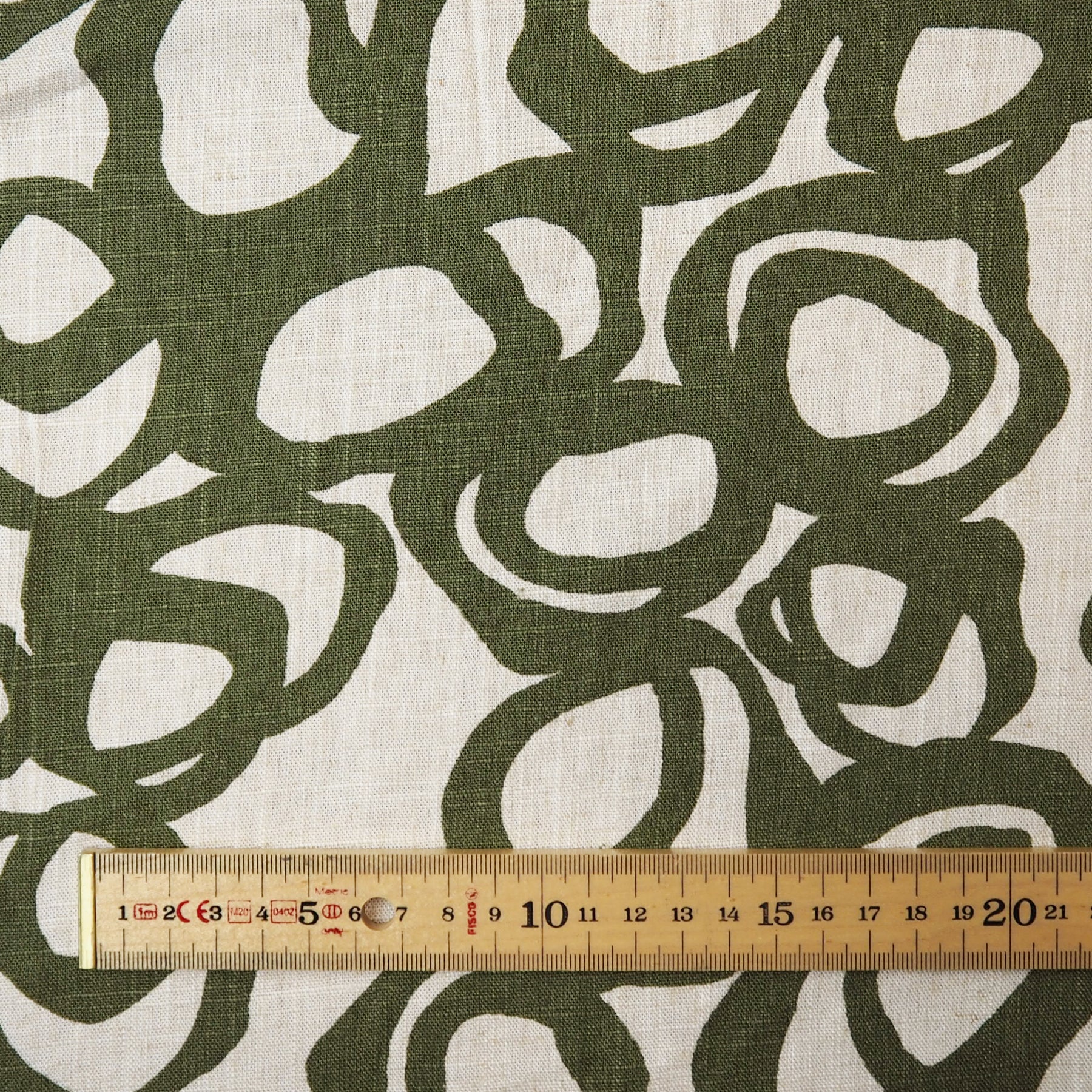 The loose, expressive scribble motifs in an olive green colour give this fabric an effortless, creative feel.