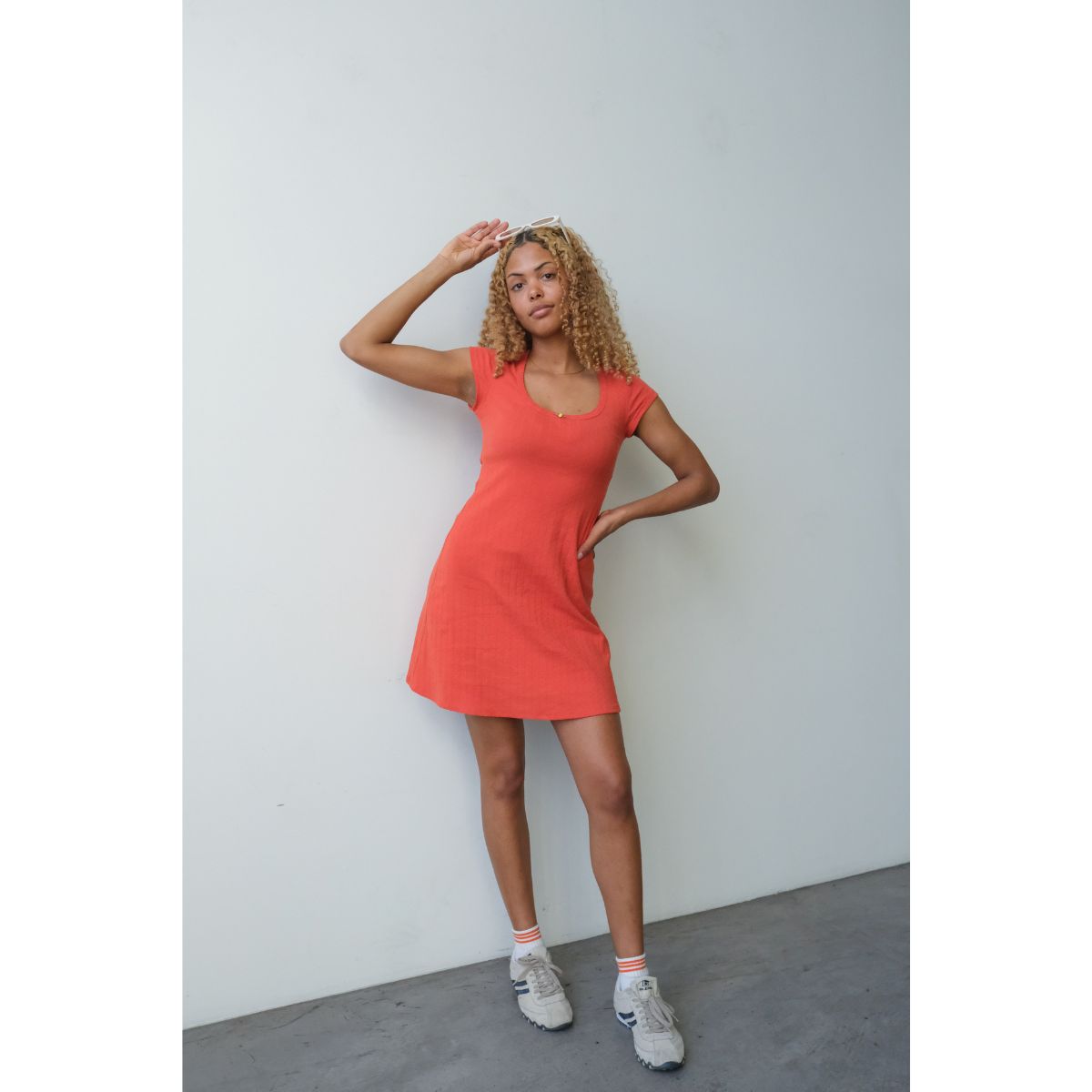 Woman in a red dress and black boots posing against a white wall.