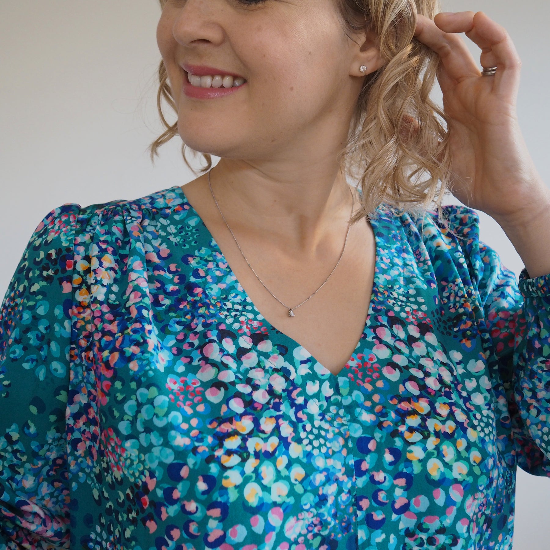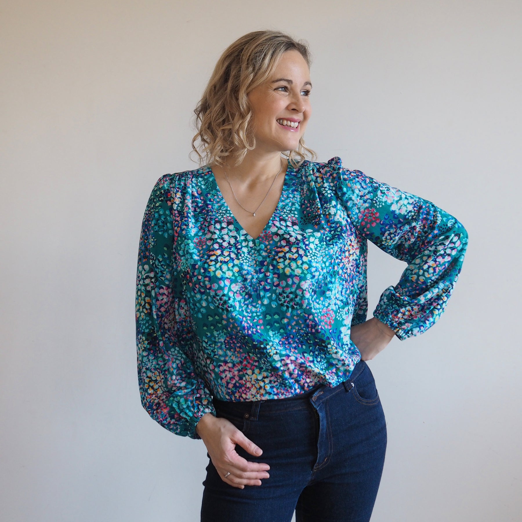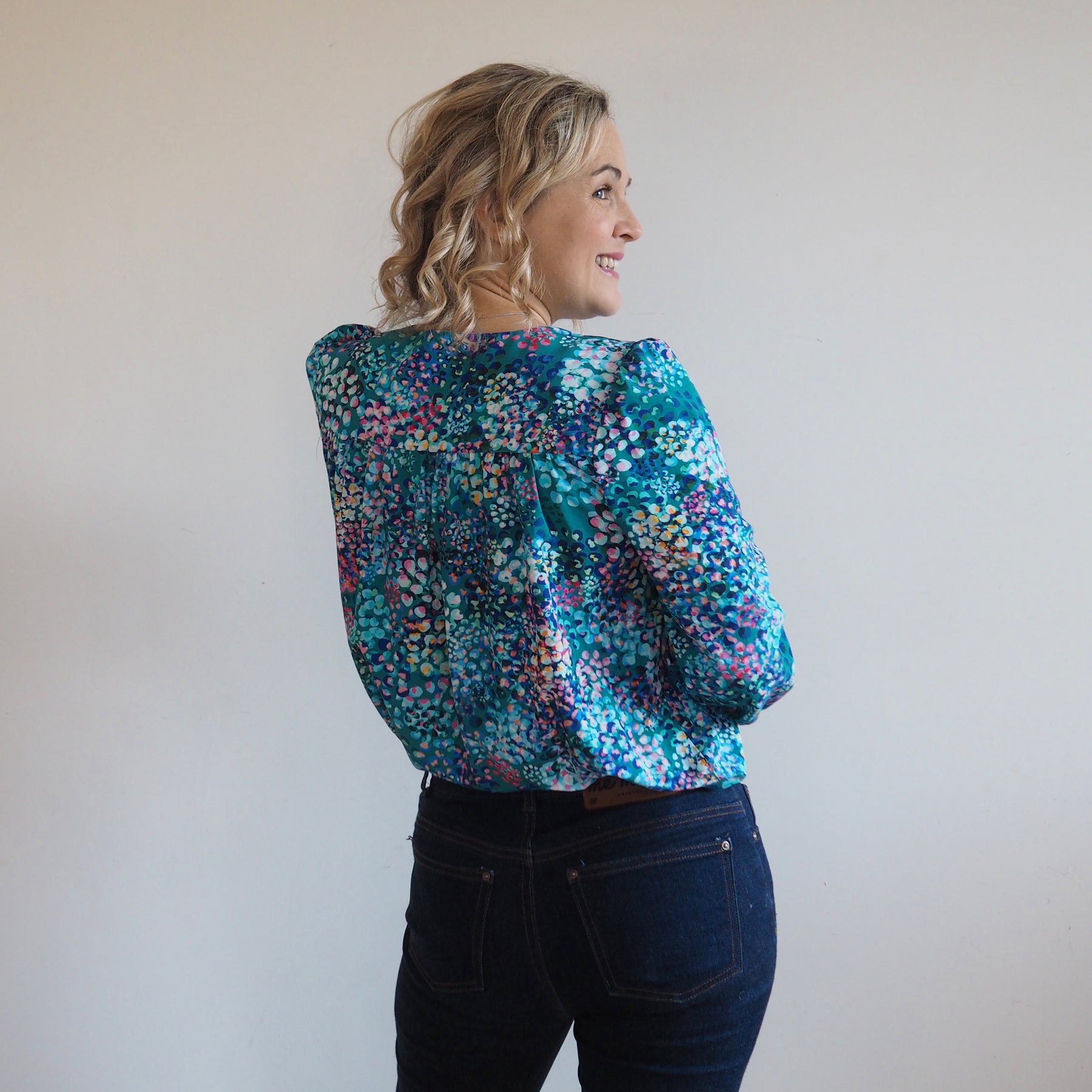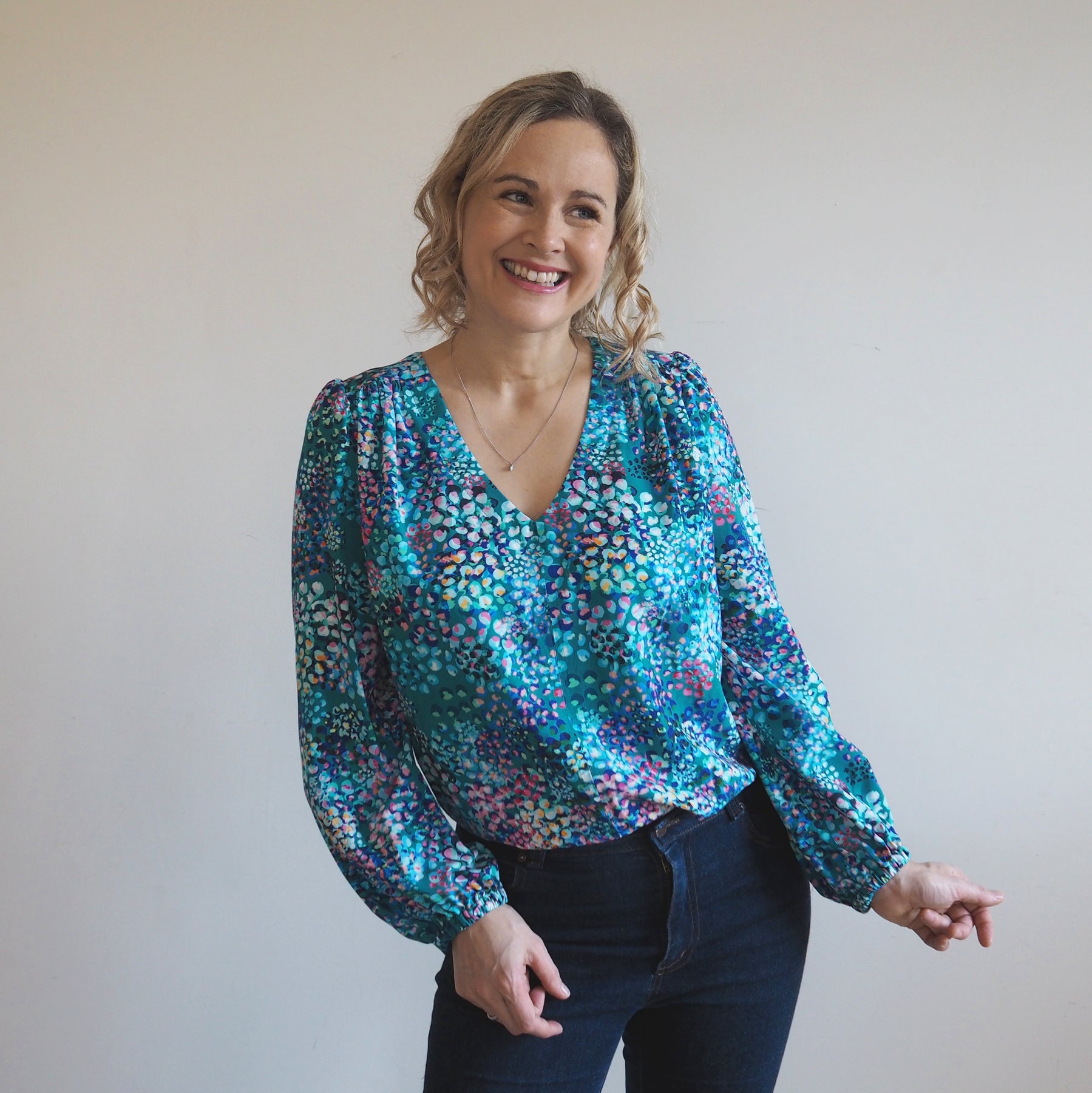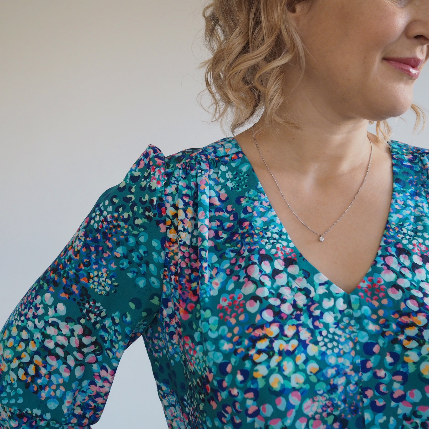 The top features a relaxed V shaped neckline with gentle gathers at the shoulders and across the back. The sleeve has a soft puff at the shoulder and can be made as a pretty short sleeve or as a long sleeve with wrist pleats for shaping and an elastic gathered cuff. Choose between two neckline finishes: a sleek topstitched facing or a bias-bound finish, which is complemented by delicate rouleau button loops at the centre front. We have included fabric covered buttons with this kit to add an extra special touch that highlights the beautiful fabric.