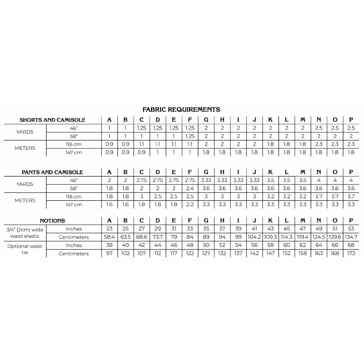 The camisole is fitted and designed for low recovery knits. The best examples are pointelle knits, cotton double knits, and rib knits with less than 4% spandex content. It will not work well with high spandex knits. Because the bottoms are quite relaxed, they can be made with many lightweight fabrics with good drape, in both knits and wovens. You can make the bottoms in cotton jerseys, cotton voile, viscose, and silk under 6 oz/sq yard or 205 GSM.