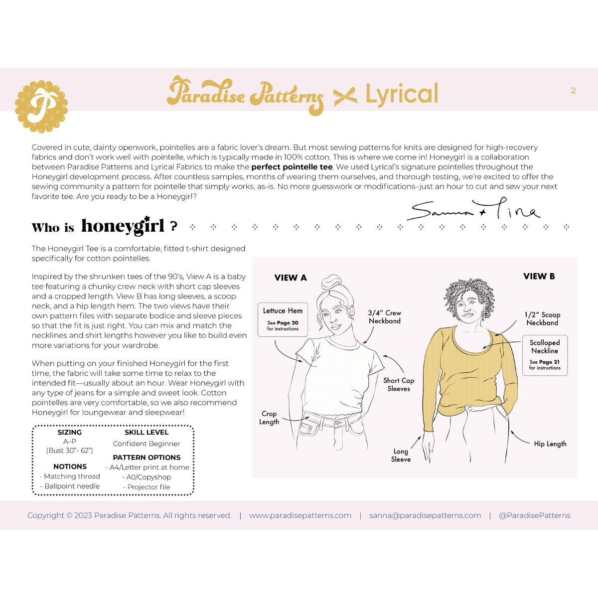 Honeygirl works best with knits wit high stretch ad low recovery. For compatibility with the neckband, the fabric must have 60% horizontal stretch. The best options are cotton double knits, rib knits, and thermal kits with less than 5% spandex.