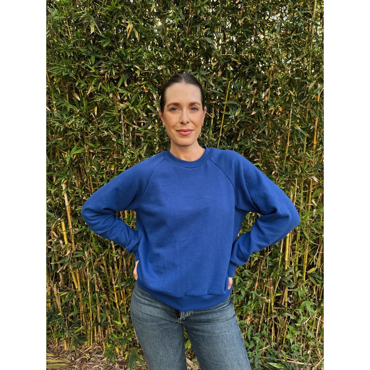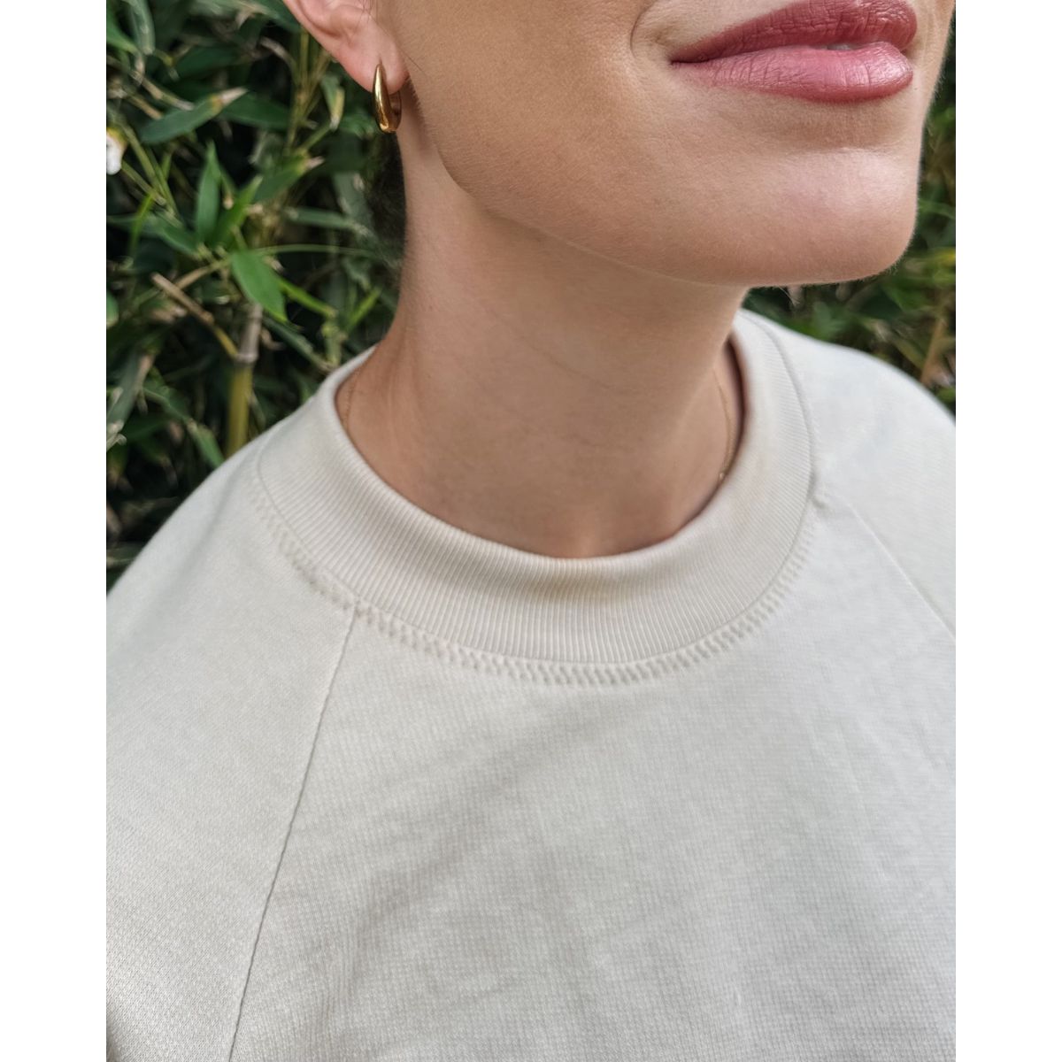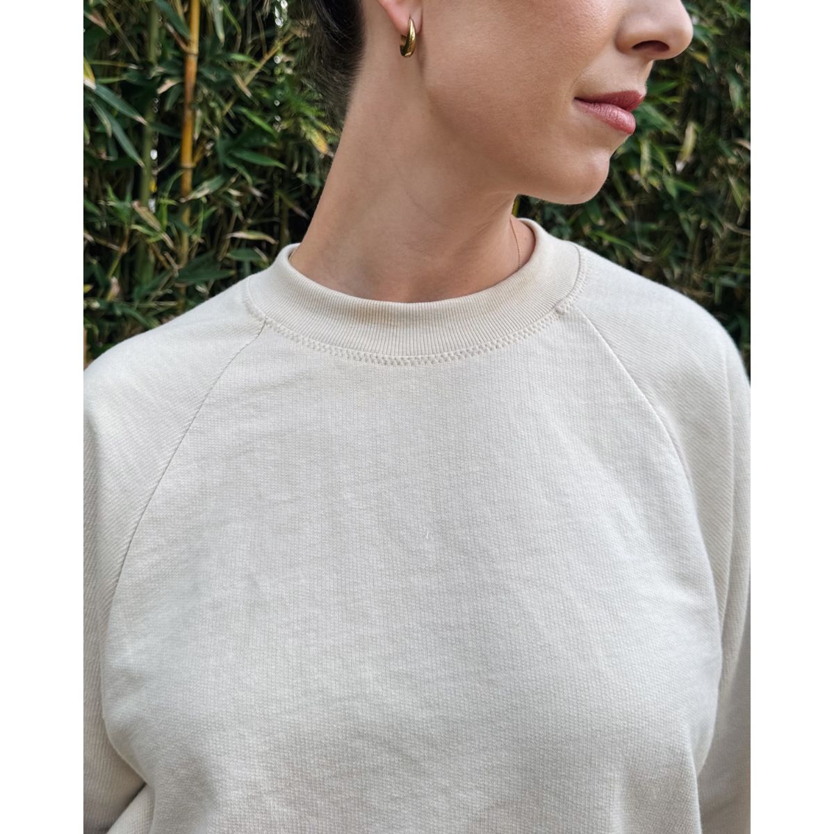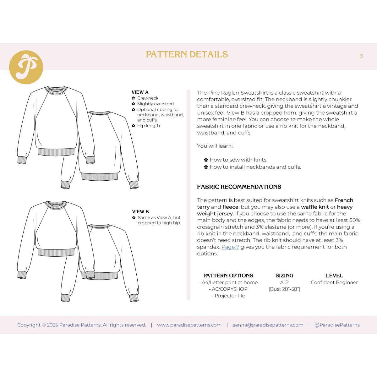 The pattern is best suited for sweatshirt knits such as French terry and fleece, but you may also use a waffle knit or heavy weight jersey. If you choose to use the same fabric for the main body and the edges, the fabric needs to have at least 50% crossgrain stretch and 3% elastane (or more). If you’re using a rib knit in the neckband, waistband, and cuffs, the main fabric doesn’t need stretch. The rib knit should have at least 3% spandex.