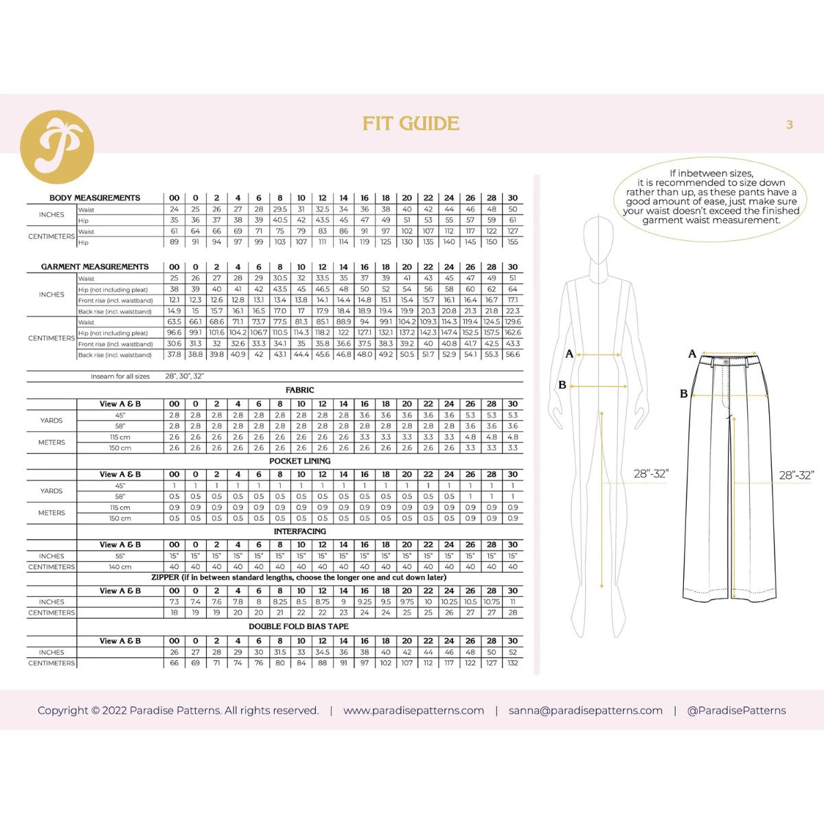 These trousers will have a completely different look depending on the fabric you choose, but I do recommend something with a good drape and also something that doesn’t grow as you work with it or wear it. A light, drapey fabric will look lovely and flowy. A mid-weight cotton/linen will look so relaxed and cool. Or you can choose a mid-to heavyweight for a chic winter pant. You won’t need pocket lining fabric or pocket facing if using lightweight fabric, in that case you can use your main fabric. (Rayon/Tencel/Lyocell twill, challis or crepe, Linen, Linen blend, Cotton, light to heavy Wool, Corduroy, Denim, Silk, Satin)
