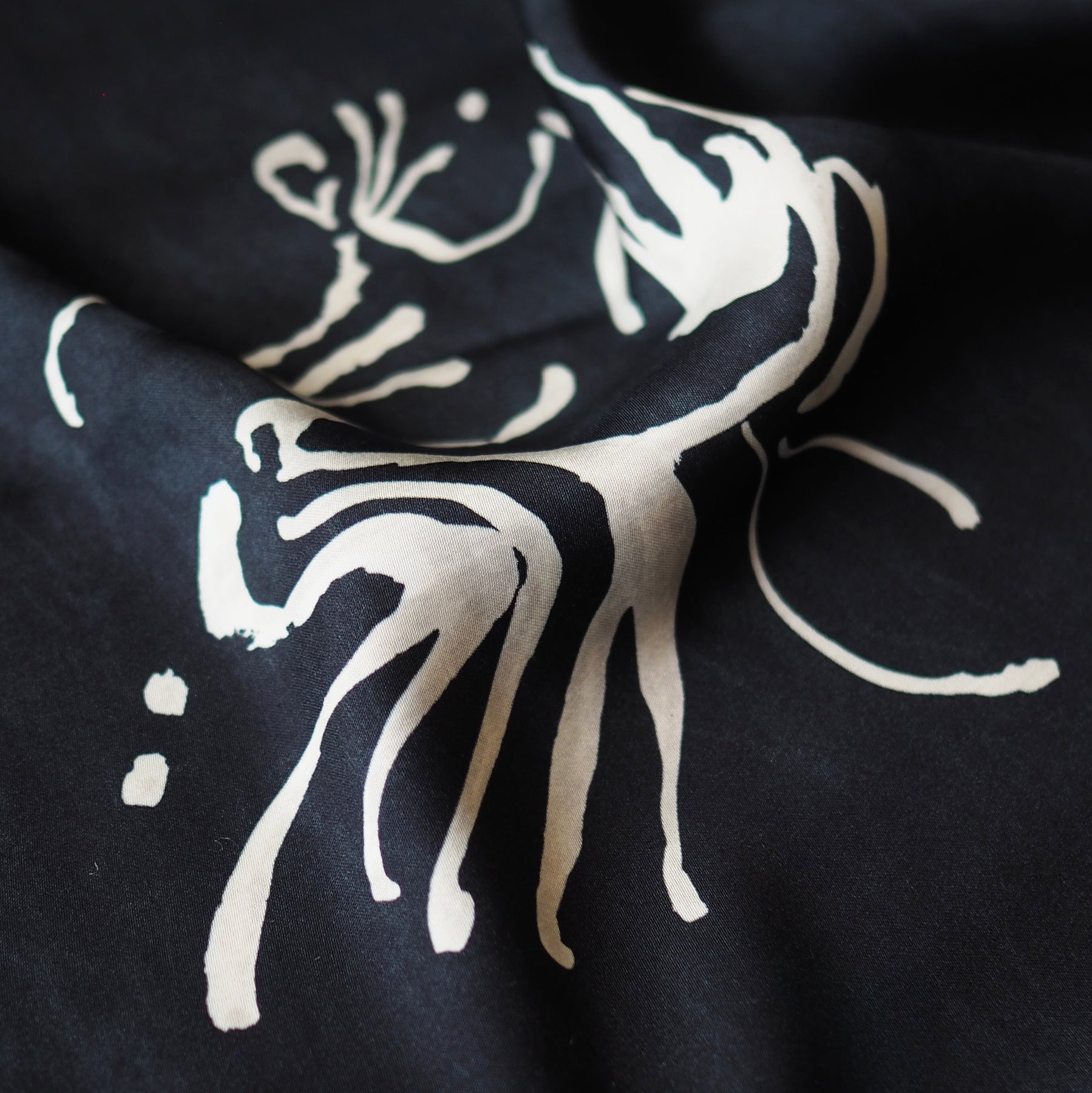 This fabric features an abstract botanical print set against a deep midnight grey background. The contract between the pattern and the dark base creates an elegant and slightly dramatic look.