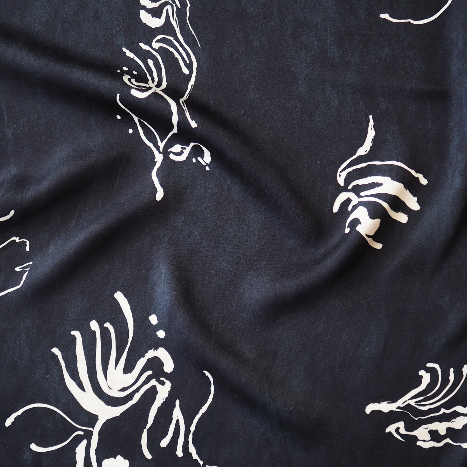 This Midnight Botanical Viscose Sateen is a beautifully drapey dressmaking fabric featuring an abstract floral design on a dark background.