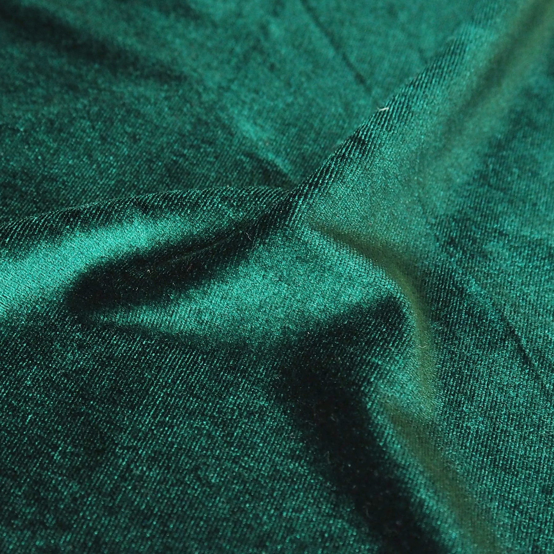 Emerald green stretch velour fabric with soft sheen for dressmaking.