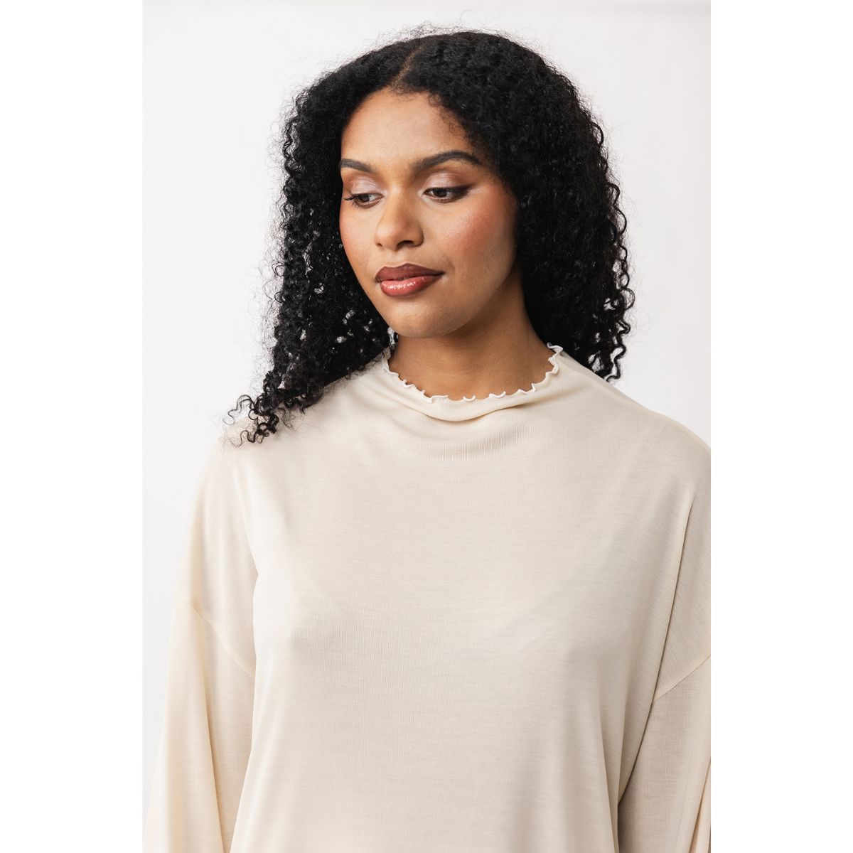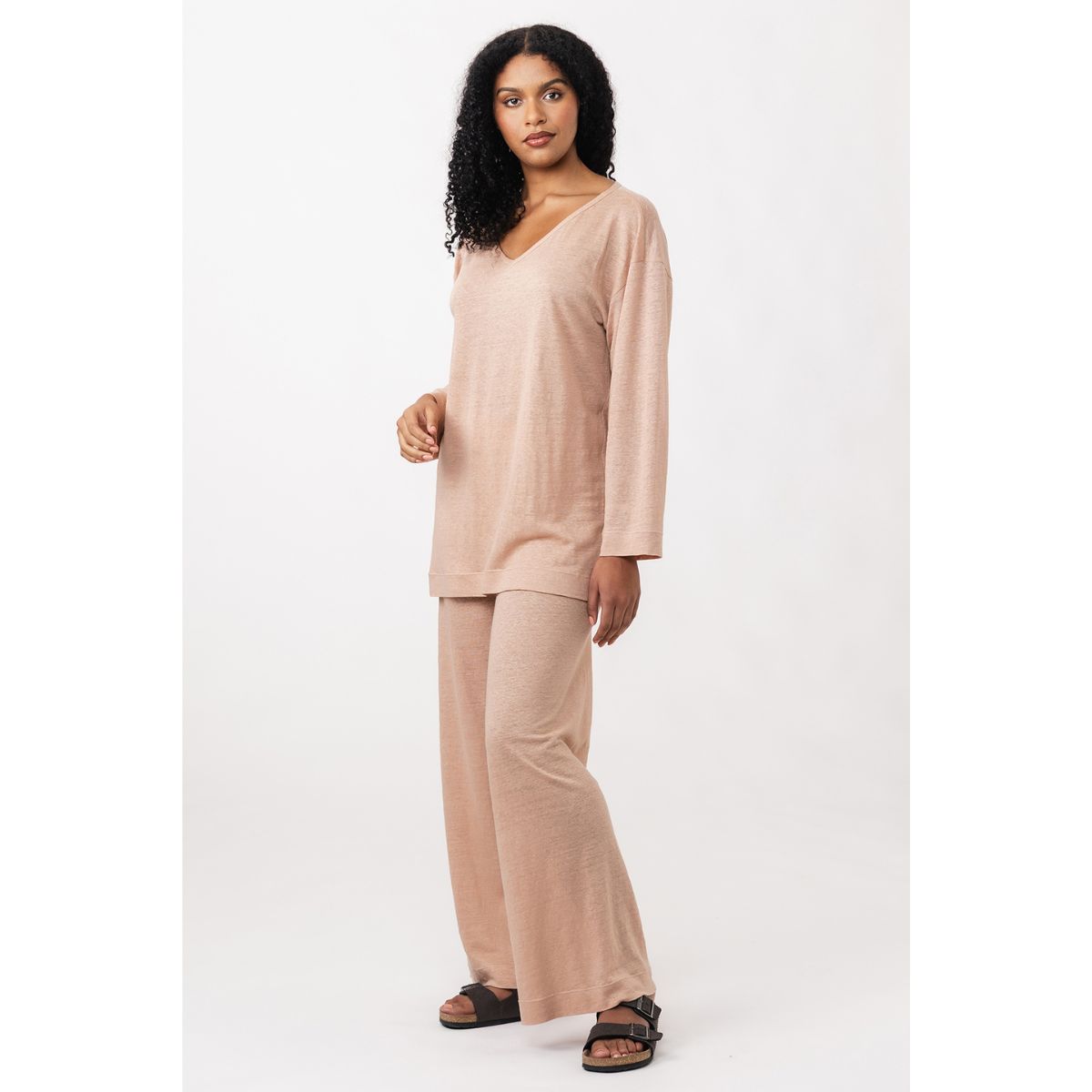 Select a light to medium-weight knit fabric with approximately 40–50% stretch. A lighter and slightly drapey fabric is recommended for the rolled hem variation, while the V-neck works better with medium-weight, stable knits.