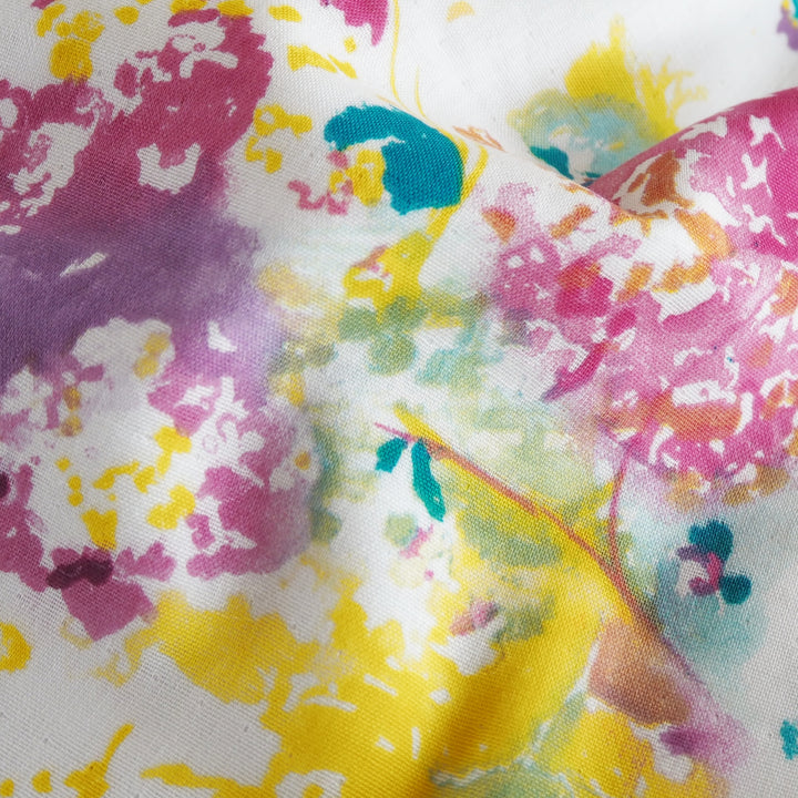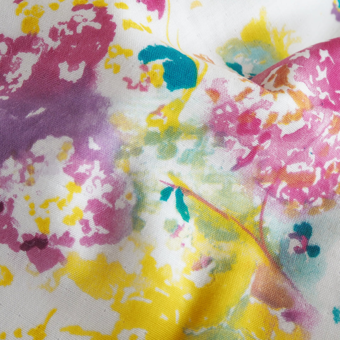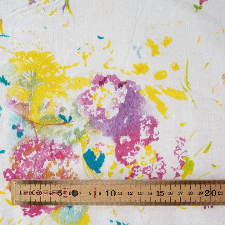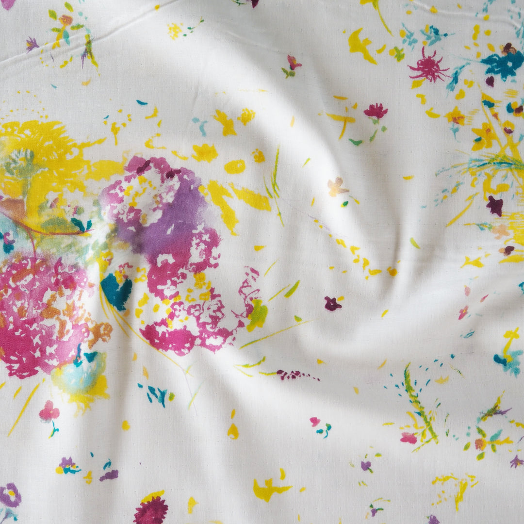 This Nani Iro Encounter White Organic Cotton Double Gauze Fabric is from the latest 2024 Nani Iro collection, featuring a watercolour scattered floral design in beautiful fuchsia pink, yellows and purples on a white background.