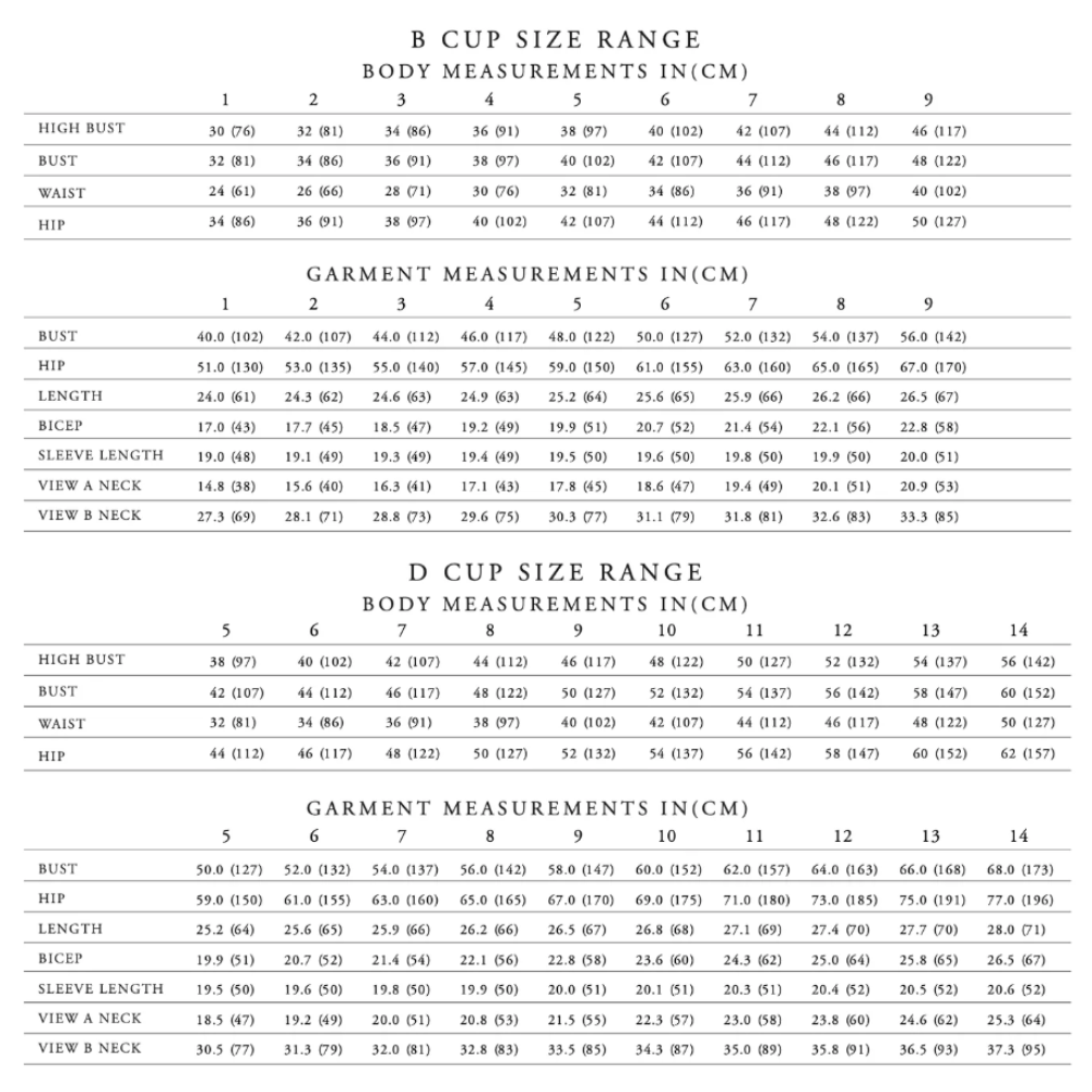This pattern is available in two size ranges: sizes 1-9 (UK 6-22, B Cup) and sizes 5-14 (UK 14-32, D Cup). Bust 32-60”, waist 24-50” & hips 34-62”.