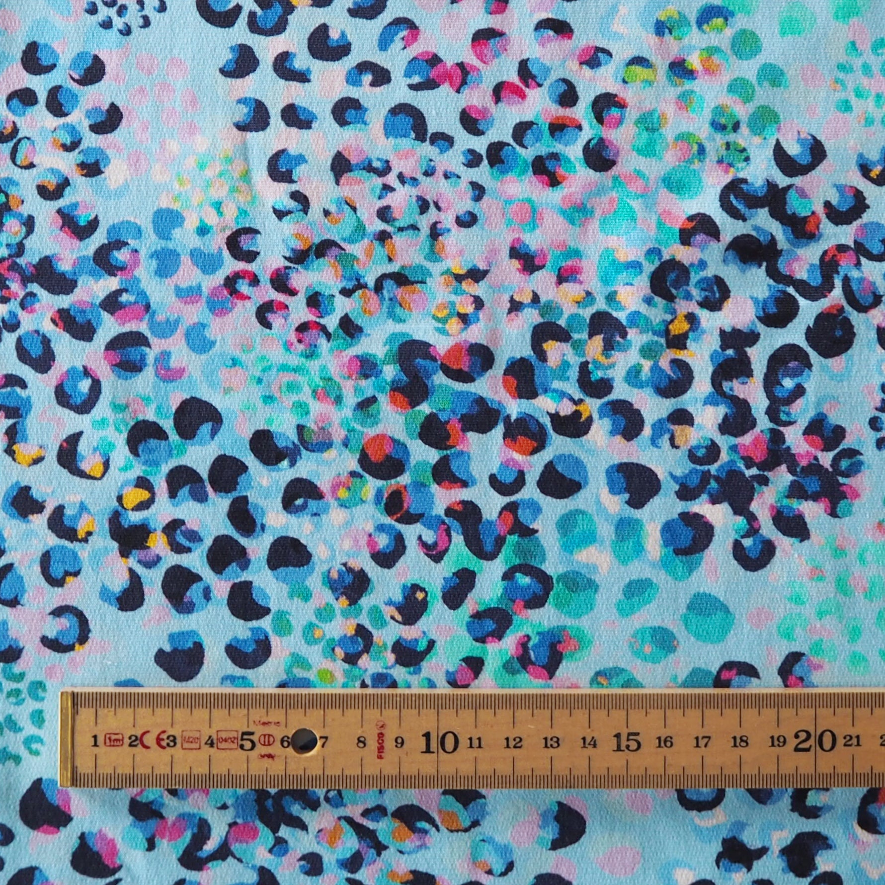 The Sky Blue Chicacheetah design by Rachel Parker adds a cheerful twist to cosy dressing. Featuring an abstract cheetah motif in playful tones of bright colours from fuchsia, blue, pink and green against a soft sky blue base, it’s a contemporary print that balances fun and sophistication - ideal for brightening up your me-made wardrobe.